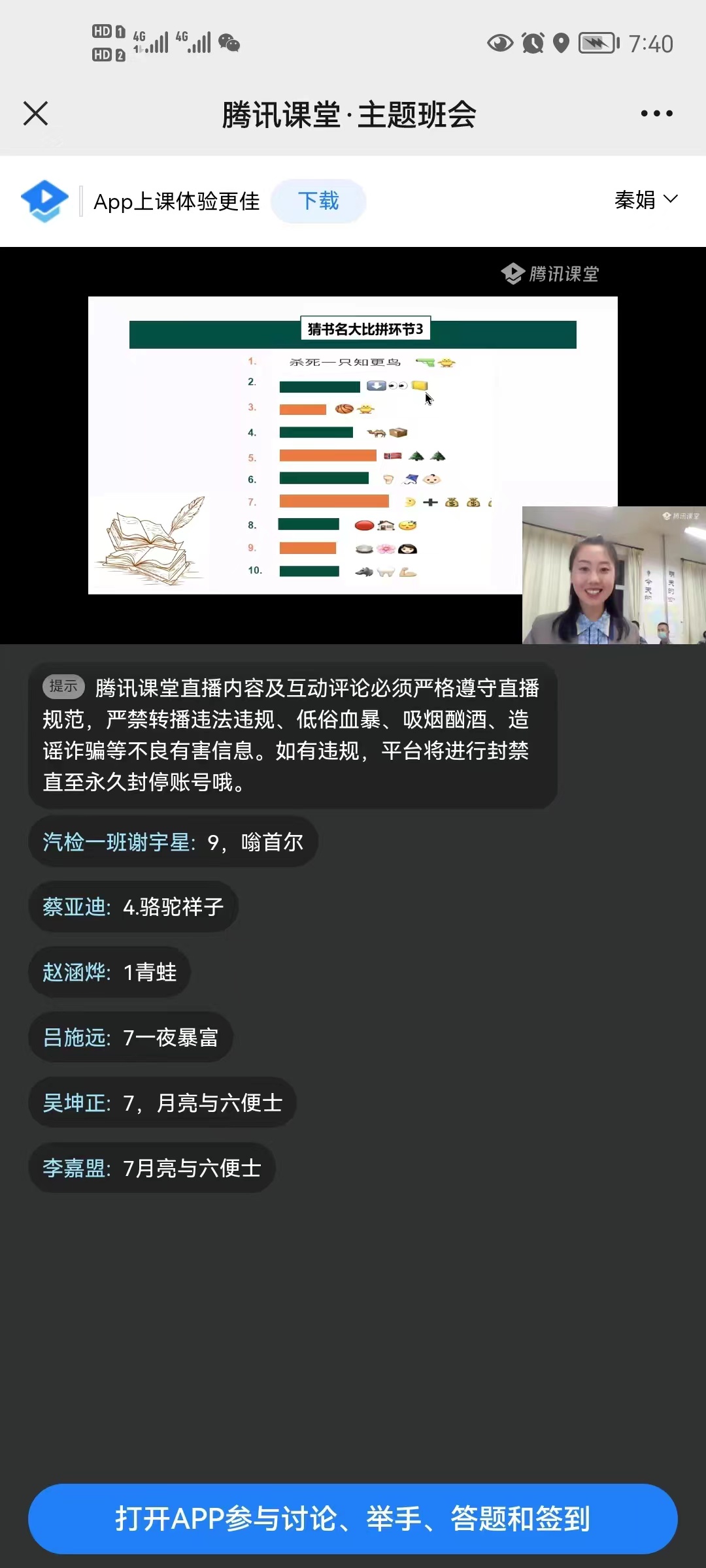 在“好读书”环节,郭雪慧对班级电子图书馆借阅情况进行点评,鼓励大家充分利用手边的资源,培养爱读书的好习惯。有奖猜书名大比拼活动,同学们踊跃参加、积极互动,将活动推向了高潮。在“读好书”环节,同学们分享了《许三观卖血记》《平凡的世界》《狼图腾》《温暖如你》等作品,畅谈了自己的读书感受,传递了读书带给自己不一样的体验,呼吁大家一起读书。